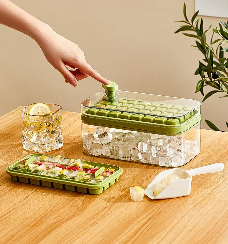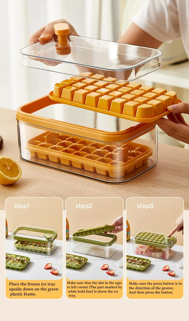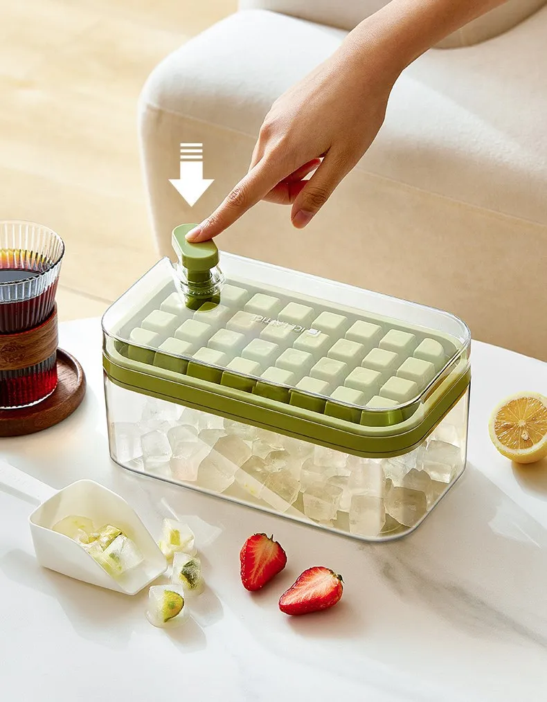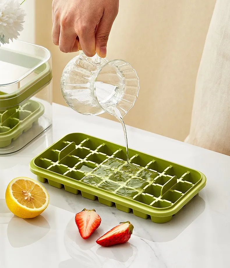 One-hand release ice cube tray: This ice trays for freezer is designed with an innovative release design, which makes it easier to release. Just place the ice tray in the right position and press the green button on the lid with your finger and you can easily release the ice cube.
