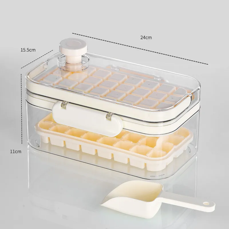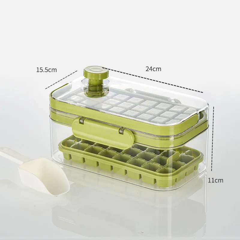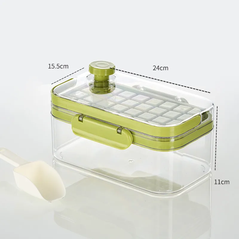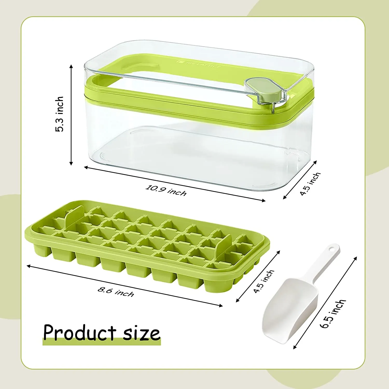 Package: The package contains two or one 32pcs green ice trays, a clear container and clear lid, and an ice scoop. You can store the ice cubes with the transparent container.